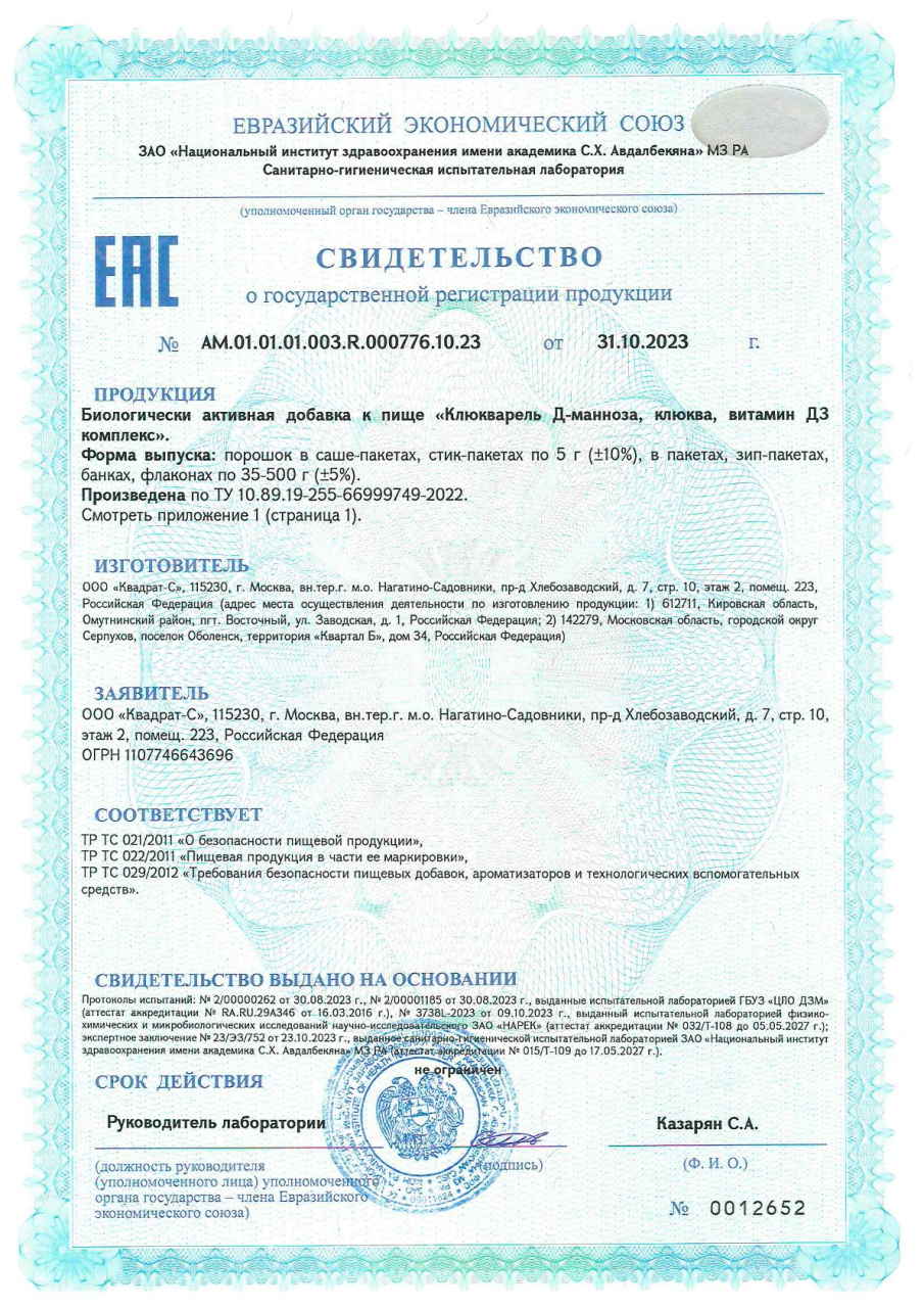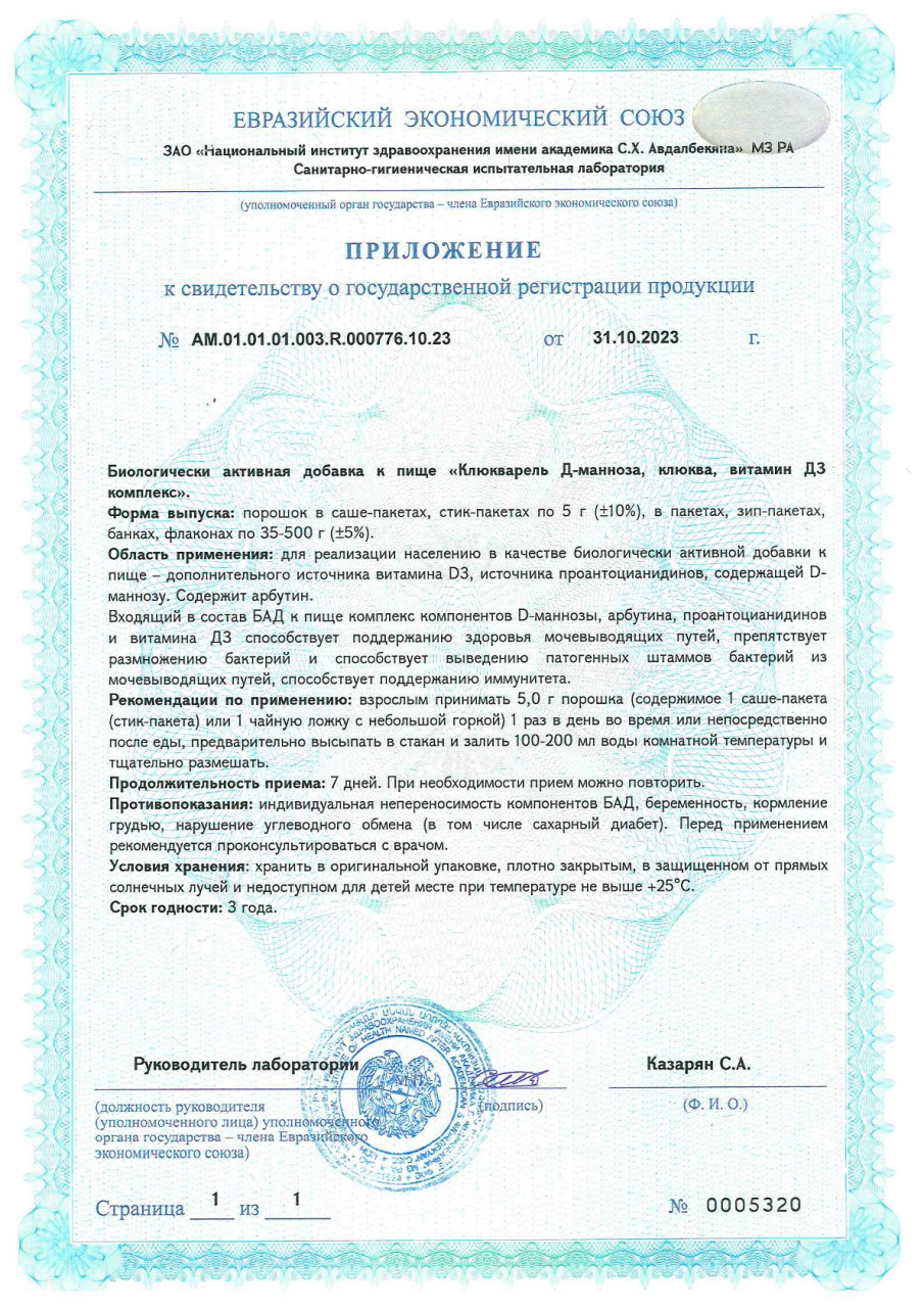 D-манноза, сахар, экстракт плодов клюквы, регулятор кислотности — лимонная кислота, плоды клюквы (порошок), ароматизатор натуральный «Клюква» (содержит носитель — пропиленгликоль), крахмал картофельный, холекальциферол (витамин D3).